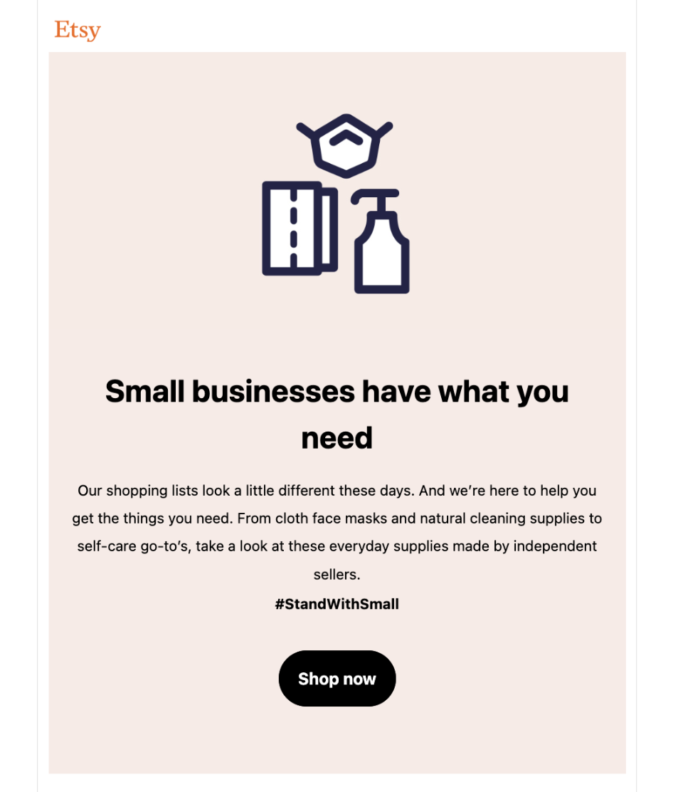 In March 2020, the world went into lockdown, and everything changed, including our own personal economies. People around the globe needed to find new ways to make money, buy goods, and keep their families as safe as possible. Etsy became one of the first places consumers could find and purchase handmade masks. Etsy also became the go-to site for all-things comforting and cozy – the things we all yearned for most during that time. Finally, it became the platform-of-choice for new small business owners to start and grow their own shops. Here are some of the messaging moments that I, along with a team of writers, marketers, and more, created during that time and that helped the Etsy community of sellers and buyers grow, and its revenue increased by 106.7 percent. It was all done while spreading the word to “keep commerce human” and empowering people everywhere to make positive impacts on the world around them.